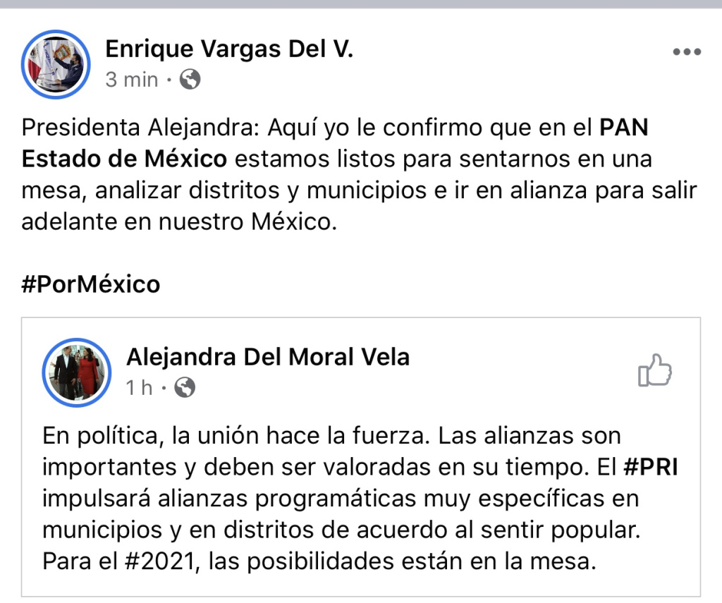 Vargas del Villar, presidente municipal de Huixquilucan y presidente de la Comisión Permanente del PAN, dijo a del Moral que su partido está listo para instalar una mesa donde se defina una alianza común.