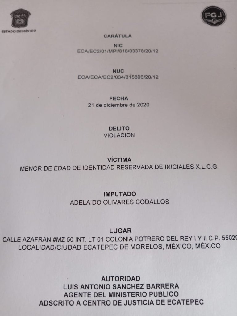 Inocencia Cruz acudió al Centro de Justicia de Ecatepec, donde inició la denuncia por el presunto delito de violación, contra el médico Adelaido Olivares, ante el ministerio público Luis Antonio Sánchez Barrera, bajo la carpeta de investigación ECA/ECA/EC2/034/315896/20/12.