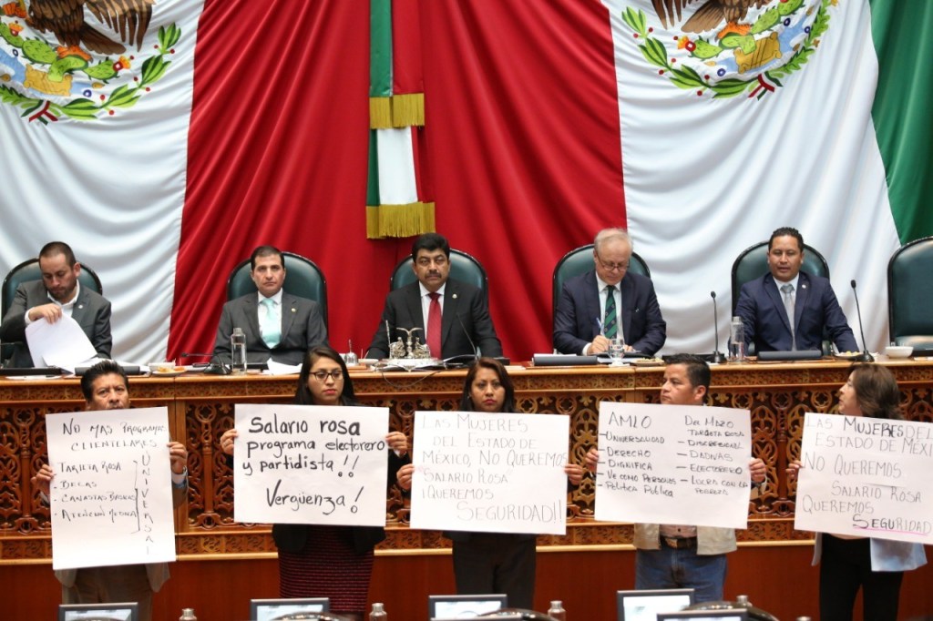 Durante la comparecencia, legisladores de Morena se pararon de sus curules para mostrar diversas cartulinas con inconformidades por la política social estatal, con leyendas como ¡Salario Rosa, programa electorero y partidista!, ¡Vergüenza!, ¡No más programas clientelares!, ¡Las mujeres del Estado de México, no queremos Salario Rosa, queremos seguridad!