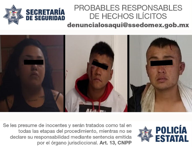 Con la información proporcionada los uniformados implementaron un operativo de búsqueda y localización de los sospechosos, logrando localizar a Melany “N”, Manuel “N” y Kevin “N” de 22, 25 y 24 años de edad respectivamente.