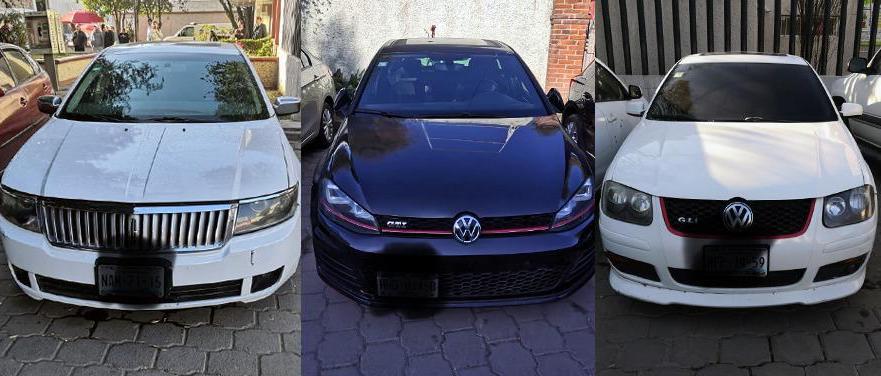 Al momento de la detención les fueron asegurados tres vehículos: uno de la marca Volkswagen, tipo Golf GTI, de color negro, modelo 2016, con placas de circulación del Estado de Hidalgo; otro Volkswagen, tipo Jetta Clásico, de color blanco, modelo 2009, con placas de circulación del Estado de México, y un automóvil de la marca Lincoln, tipo MKZ, de color blanco, con placas de circulación del Estado de México, mismo que habrían robado a los dueños momentos antes de su detención.