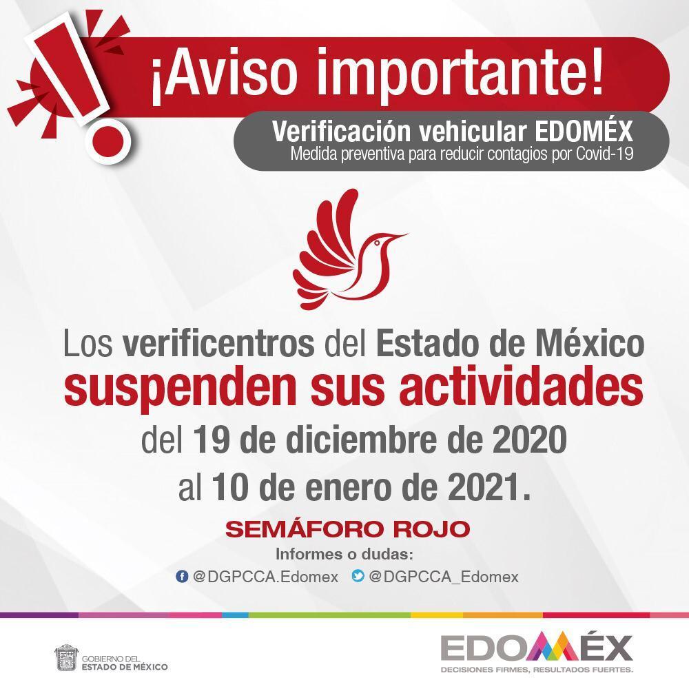 En atención a las medidas suscritas por el Gobernador del Estado de México Alfredo Del Mazo, en coordinación con el Gobierno de la Ciudad de México, para mitigar y controlar los Riesgos para la Salud que implica la enfermedad por el Virus (COVID-19), la Secretaría del Medio Ambiente (SMA), a través de la Dirección General de Prevención y Control de la Contaminación Atmosférica (DGPCCA), informan que los Verificentros de la entidad suspenderán actividades del 19 de diciembre de 2020 al 10 de enero de 2021.