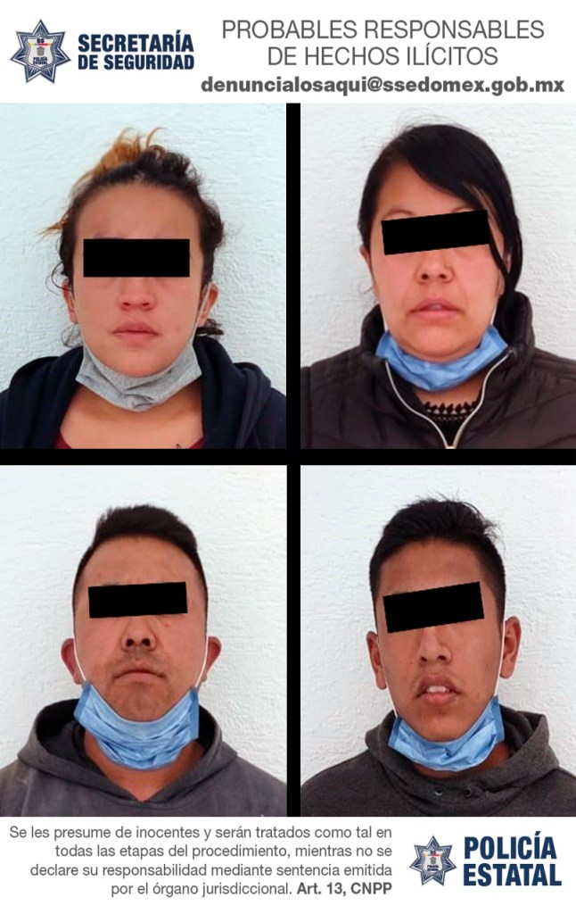 Derivado de los operativos integrales de seguridad implementados en la entidad mexiquense, elementos de la Secretaría de Seguridad (SS), detuvieron a cuatro personas de las cuales dos son mujeres y el resto hombres, luego de ser señalados como los probables responsables de sustraer ilegalmente a una menor de edad de un albergue público.