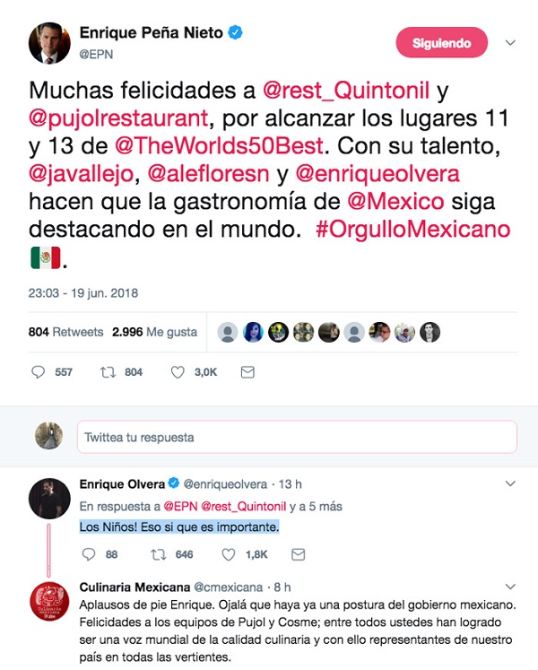 El chef Enrique Olvera, uno de los más importantes del mundo, urgió al Enrique Peña Nieto a que atienda la crisis con los niños separados de sus familias por orden del mandatario de Estados Unidos Donald Trump, luego de que el Presidente mexicano lo felicitara porque Pujol, su restaurante, está en la lista –apenas publicada ayer– de los mejores a nivel internacional.