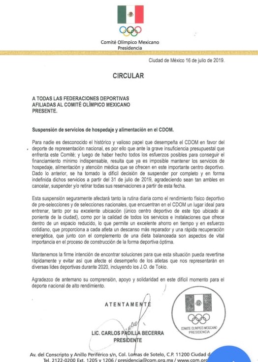 El presidente del Comité Olímpico Mexicano (COM), Carlos Padilla Becerra, envió una circular a las federaciones deportivas para informar que, a partir del 31 de julio, el Centro Deportivo Olímpico Mexicano (CDOM) dejará de prestar los servicios de hospedaje, alimentación y atención médica a los deportistas, en virtud de la falta de presupuesto.