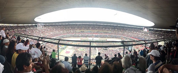 Según el narrador, llegar al Azteca también fue un “alarde en las formas”, pues en 2006 y 2012, López Obrador habría contemplado la posibilidad de rentar el Azteca, pero “la cadena Televisa, dueña del recinto, no se lo rentó y sí lo hizo con Felipe Calderón y Enrique Peña Neito. Mucho ha cambiado desde entonces la situación para que 12 años después una de las fotografías más poderosas que dejan tres meses de campaña es la del estadio de futbol más grandes del mundo escuchando entusiasmado a su líder hablando ante una enorme bandera de México”.