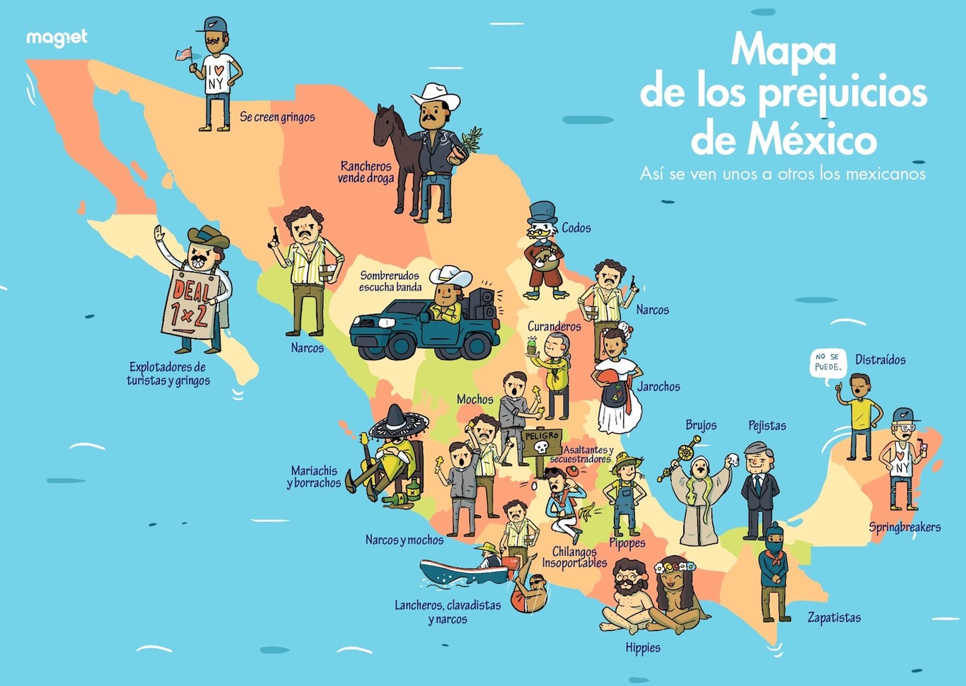 n muchos países tienen una idea del ‘mexicano promedio’ que se basa en publicidad, programas de televisión o lo que sale en internet, pero pocos saben que hay mucho más que eso. Por ello, hoy en Magnet hemos creado el mapa definitivo que ayudará a entender cómo se ven los mexicanos entre sí.