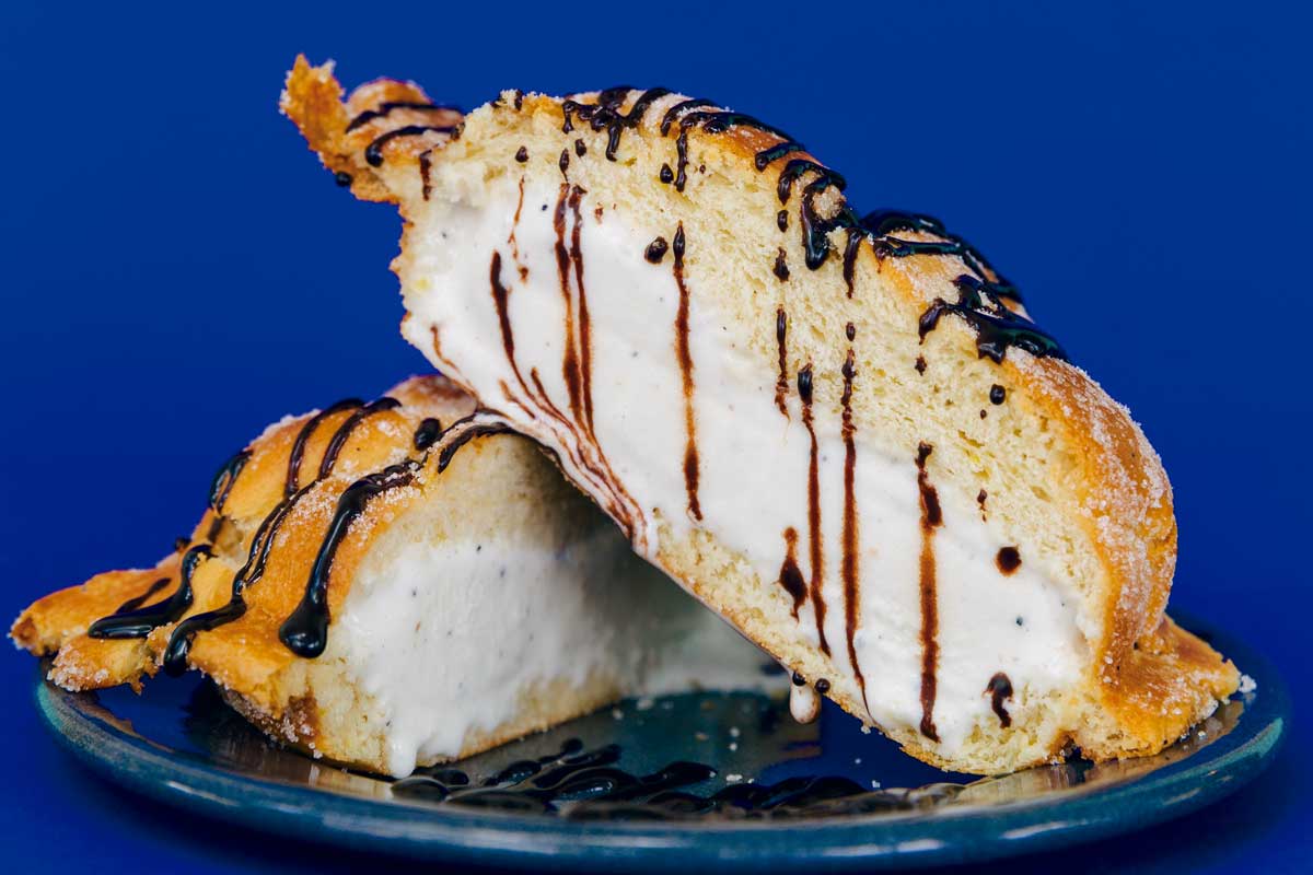 En Bigotes de Leche crearon este colosal y delicioso sándwich hecho con un pan de muerto tradicional relleno con helado de cardamomo. Luego, lo prensan en una plancha caliente para que tenga un juego de temperaturas.
