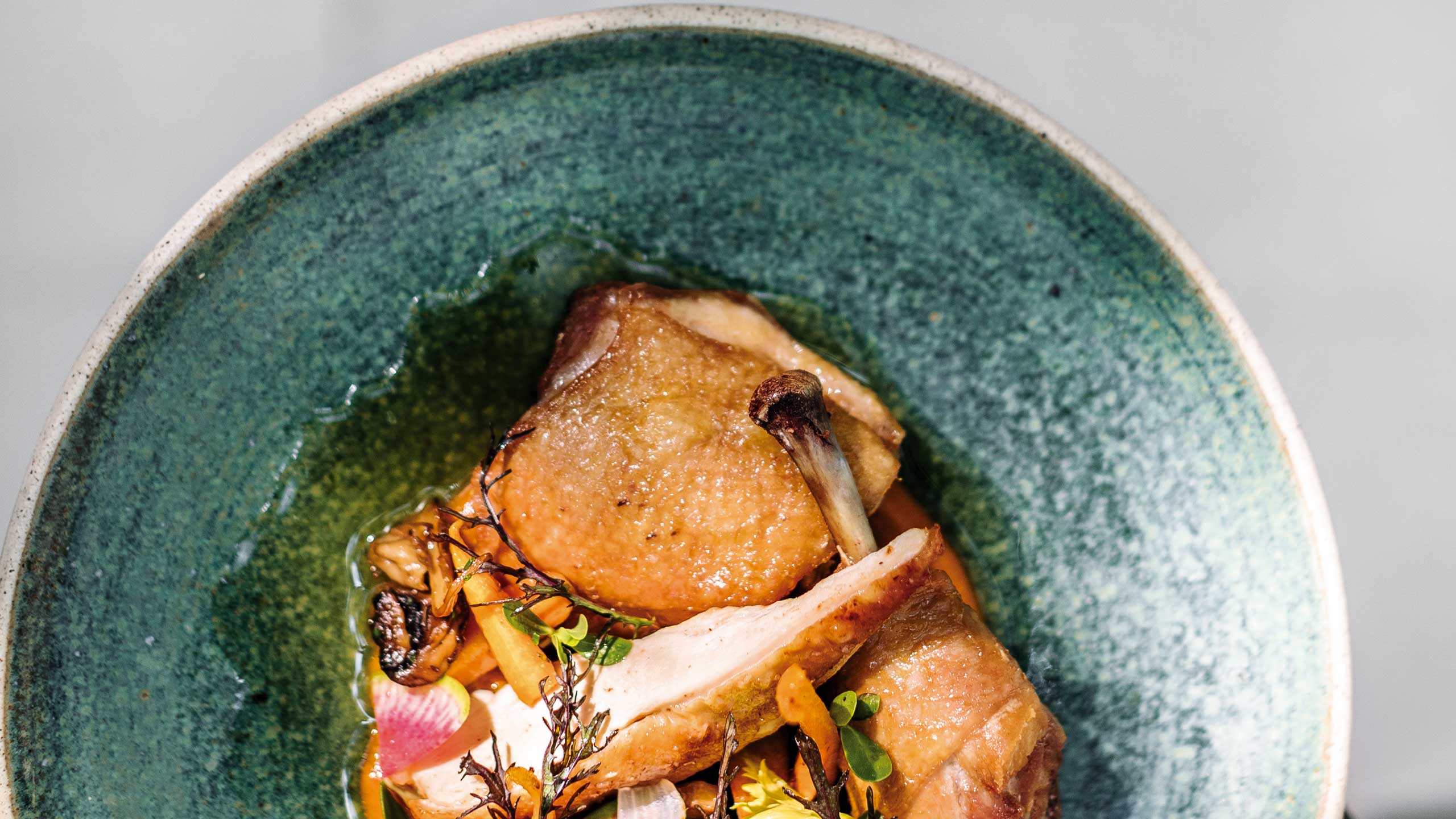 Uno de nuestros favoritos es el de Meroma. Rodney Cusic lo rostiza lentamente y lo sirve junto a un puré de zanahorias y una pasta de chiles fermentados, hongos silvestres, cebollitas encurtidas y albahaca. Jugoso y perfecto.