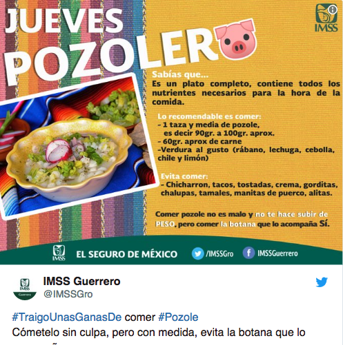 “Comer pozole no es malo y no te hace subir de peso, pero la botana que lo acompaña sí”, termina la recomendación de la dependencia.