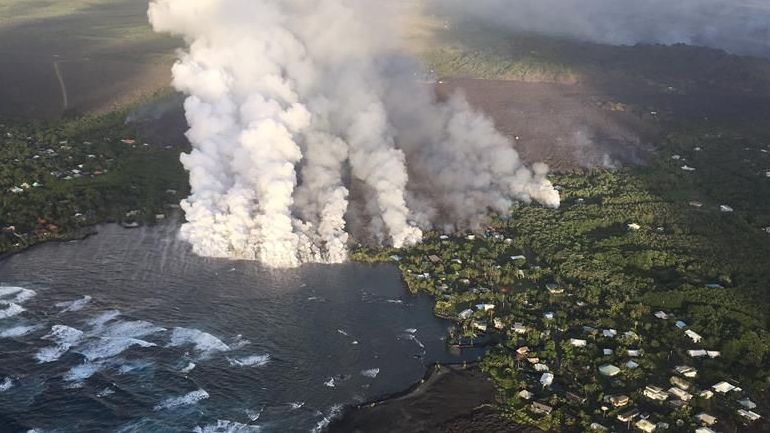 “La lava continúa entrando al océano a lo largo de un amplio frente en la Bahía Kapoho y en el área de Vacationland, y sigue arrastrándose hacia el norte de lo que queda de sus playas”, dijo la geóloga del USGS, Janet Babb.