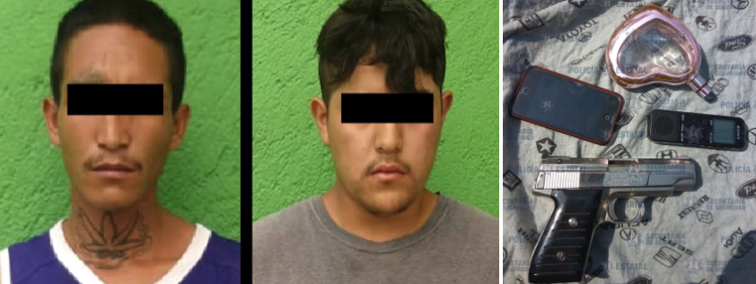 Al arribar al sitio y aprehender a José “N”, de 18 años, y a Néstor “N”, de 26 años de edad, los efectivos de la SS forcejearon con ellos al momento de subirlos a una camioneta. Uno de los presuntos delincuentes, resistiéndose al arresto, empujó y tiró de la batea a una uniformada, quien fue trasladada para su valoración al hospital del ISSEMyM de la zona, donde se reporta como estable.