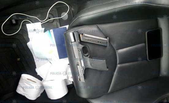 En la inspección, los efectivos de la SS encontraron en la guantera un arma de fuego, tipo escuadra 9 milímetros, con un cargador abastecido con 11 cartuchos útiles.