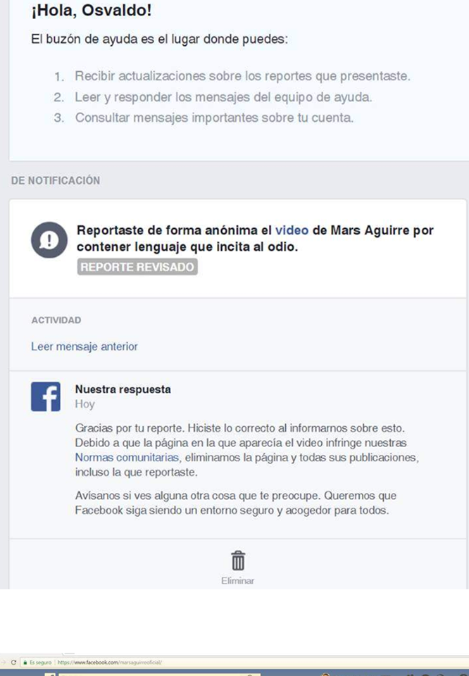 Y efectivamente el video venía acompañado de las siguientes fotografías que efectivamente demuestran que la página de Mars Aguirre fue eliminada de Facebook por burlarse de los pobres.