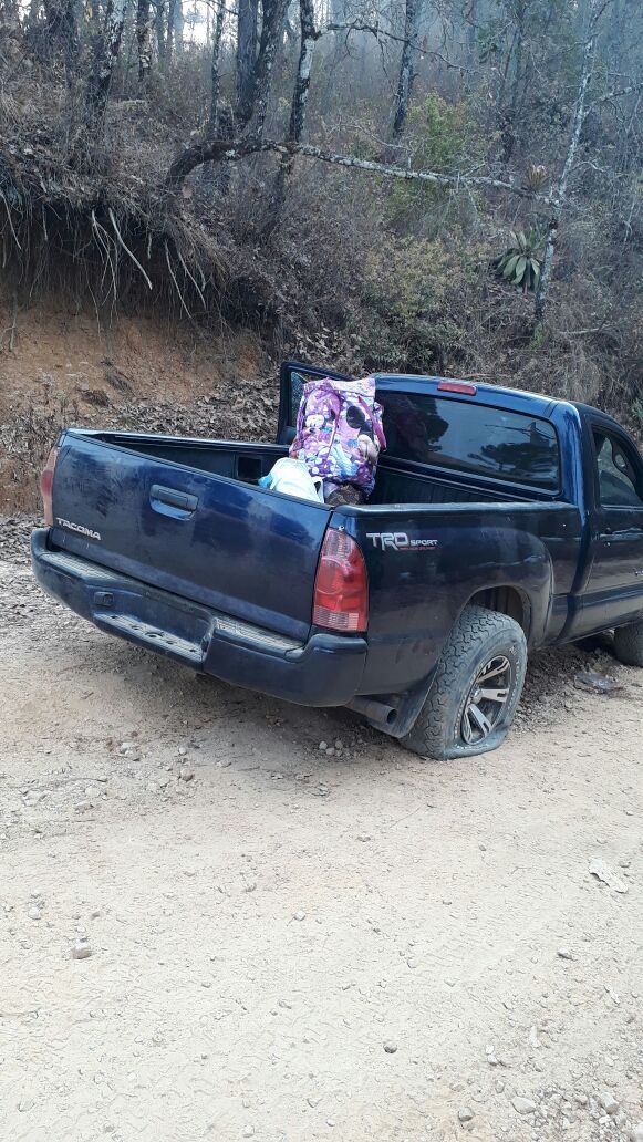 La camioneta en la que viajaban las víctimas es de la marca Toyota, tipo Tacoma, color Morado, sin placas de circulación, a la que se le observan impactos de arma de fuego en la parte frontal y batea.
