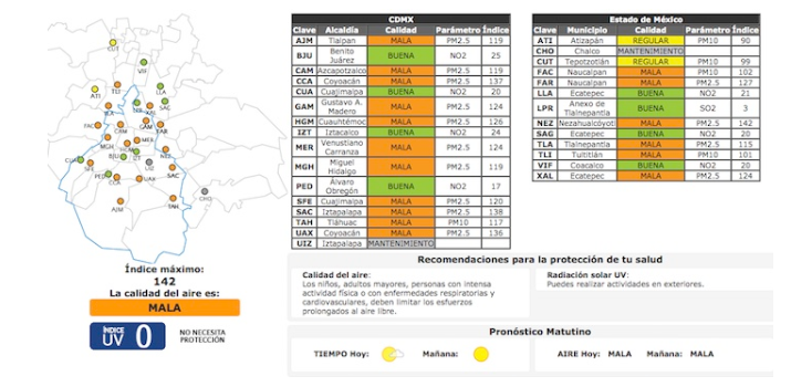 A través de su cuenta de Twitter, el organismo informó que a las 08:00 horas, el sitio con mayor presencia de partículas contaminantes es el municipio de Nezahualcóyotl, en el Estado de México, con 142 puntos.