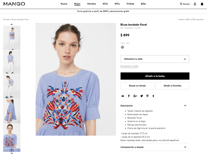 El caso de Mango difiere al anterior, porque se trata de prendas las cuales no llevan la firma de un diseñador como responsable del diseño, aunque sí aparecen en la tienda en línea.