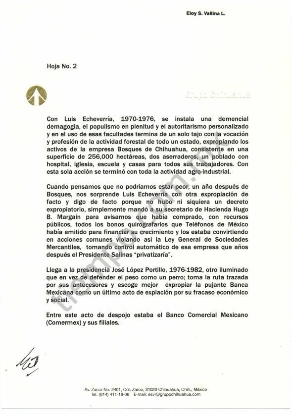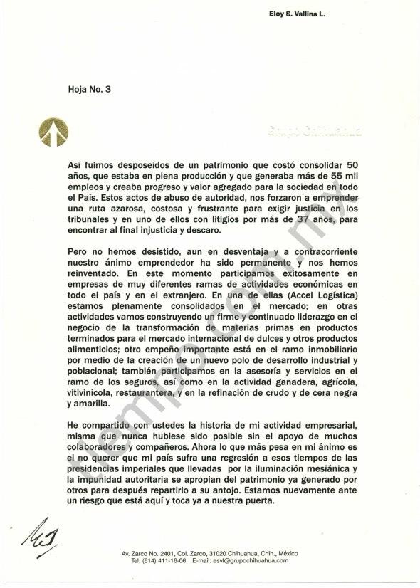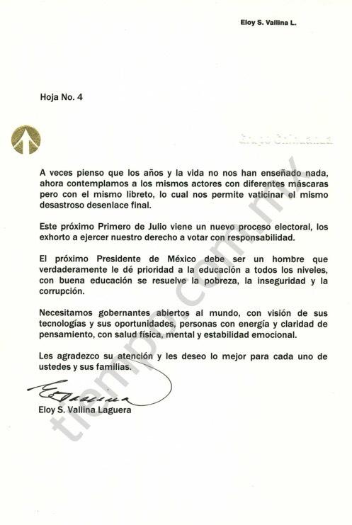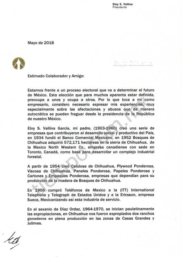 En su texto de 4 hojas, Vallina Lagüera, uno de los hombres más ricos de Chihuahua, señaló que frente al proceso electoral en curso, le preocupa que el pueblo mexicano se deje llevar por promesas mesiánicas que sólo harían retroceder los avances logrados hasta el momento.