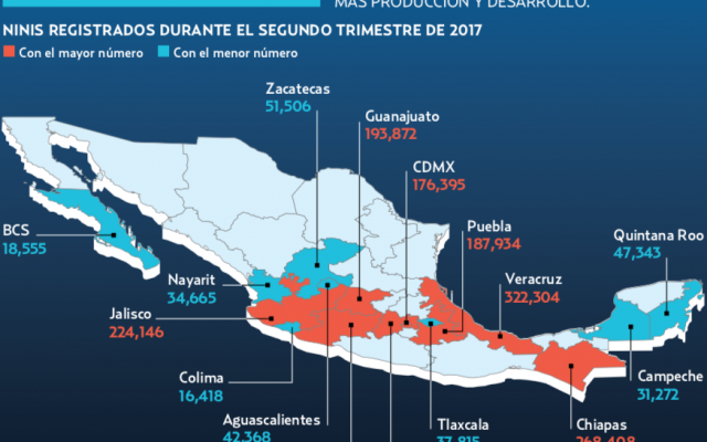 En México, 54 por ciento de los jóvenes de entre 15 y 24 años que ni estudian ni trabajan, los llamados ninis, se concentra en ocho estados, es decir, en una cuarta parte de las entidades de la República Mexicana.