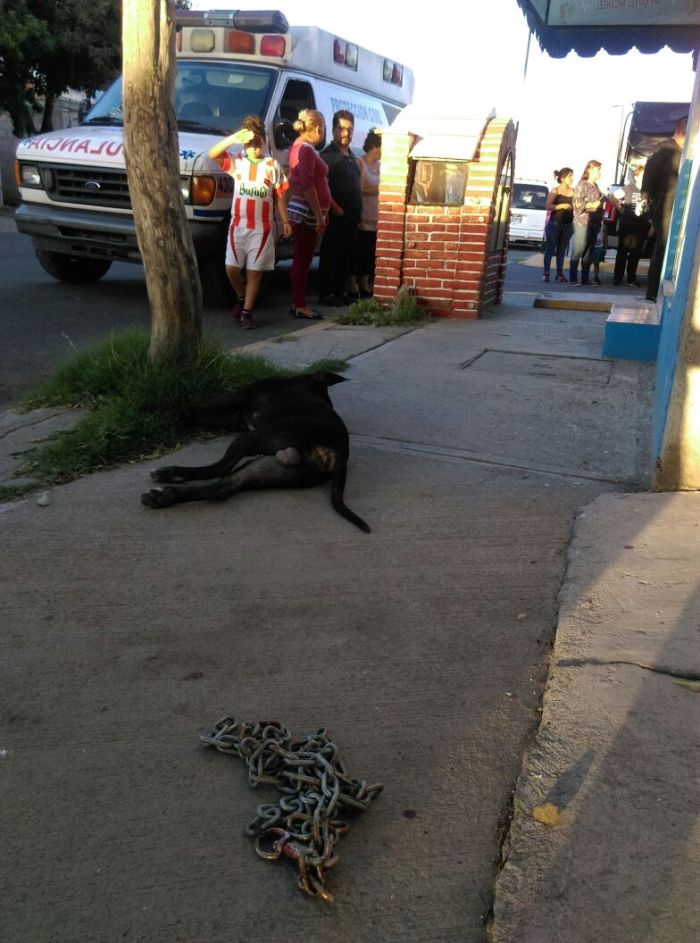 El conductor de un automóvil observó la dramática escena y detuvo la marcha de su unidad para correr a apoyar a quien intentaba someter al animal prensado de su cuello; con la llegada del vecino que logro encontrar una cuerda y amarrarla del cuello del Pitbull, se sometió esporádicamente al feroz can, y con la fuerza de los tres hombres el animal se contuvo pero murió ahorcado por su propia fuerza.
