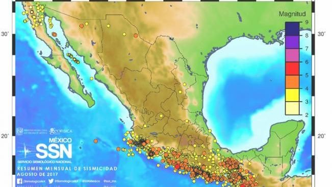 El SSN reportó 5 mil 735 temblores con epicentros dentro del territorio mexicano con magnitudes que van de 1.3 a 8.2. El 7 de septiembre ocurrió un sismo de magnitud 8.2 localizado en el Golfo de Tehuantepec, el movimiento ocurrió a las 23:49 horas, fue sentido en el sur y centro del país, y ocasionó fuertes daños en el istmo de Tehuantepec. Este sismo presentó gran cantidad de réplicas, muchas de las cuales no pudieron ser localizadas por sus pequeñas magnitudes.