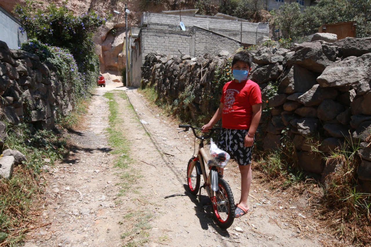 Con las medidas sanitarias necesarias, los primeros 15 menores en recibir su premio esperaron afuera de su vivienda su bicicleta o triciclo.