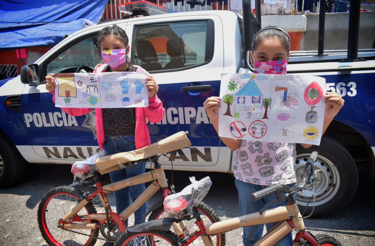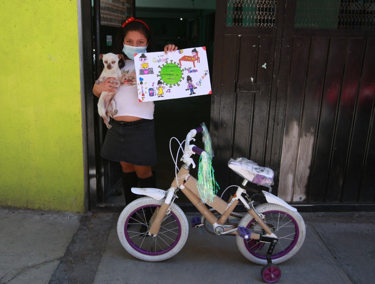“Yo le digo a los niños y niñas que se queden en sus casas y que sigan las medidas necesarias para que estemos bien todos”, comentó al recibir su bicicleta en manos de elementos de la Policía de Género.