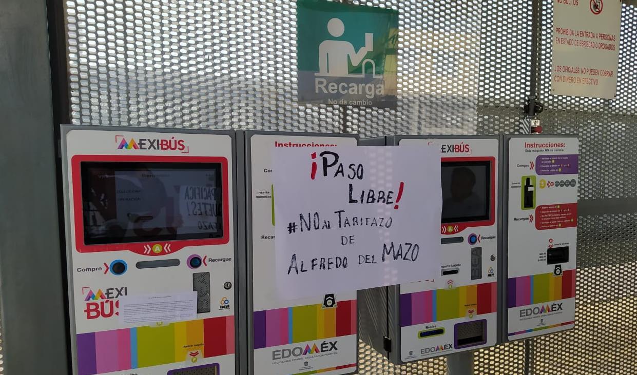 Más de 80 personas se manifestaron en diferentes estaciones de la Línea 3 del Mexibús, que va de Pantitlán a Chimalhuacán, para exigir la cancelación al aumento de la tarifa del transporte público del Estado de México.
