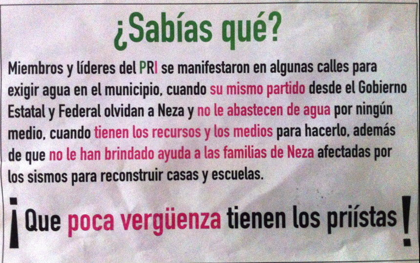 A más de un mes del sismo del 19 de septiembre pasado y el del 7 de septiembre los problemas de abastecimiento de agua potable siguen siendo un problema para la administración; en estos últimos días durante la noche y madrugada de cada día sujetos no identificados están repartiendo en las casas del territorio local un panfleto donde tachan a los priistas de sinvergüenzas.