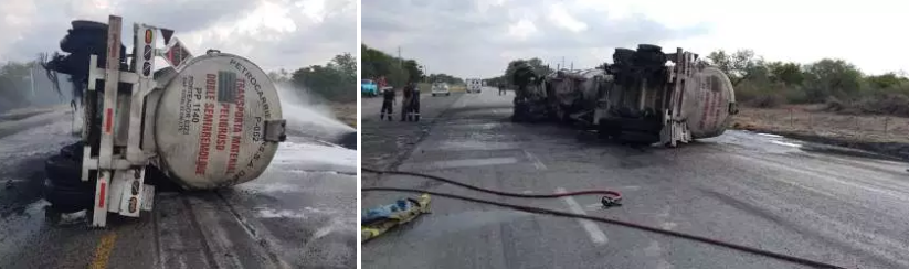 Esta unidad pesada de doble remolque tipo tanque con placas 66AD4X de marca Kenworth, pertenece a la empresa Petrocarrier y era conducida por Gilberto Ojeda Rayón; al lugar acudieron los servicios de emergencia para brindar la atención necesaria.