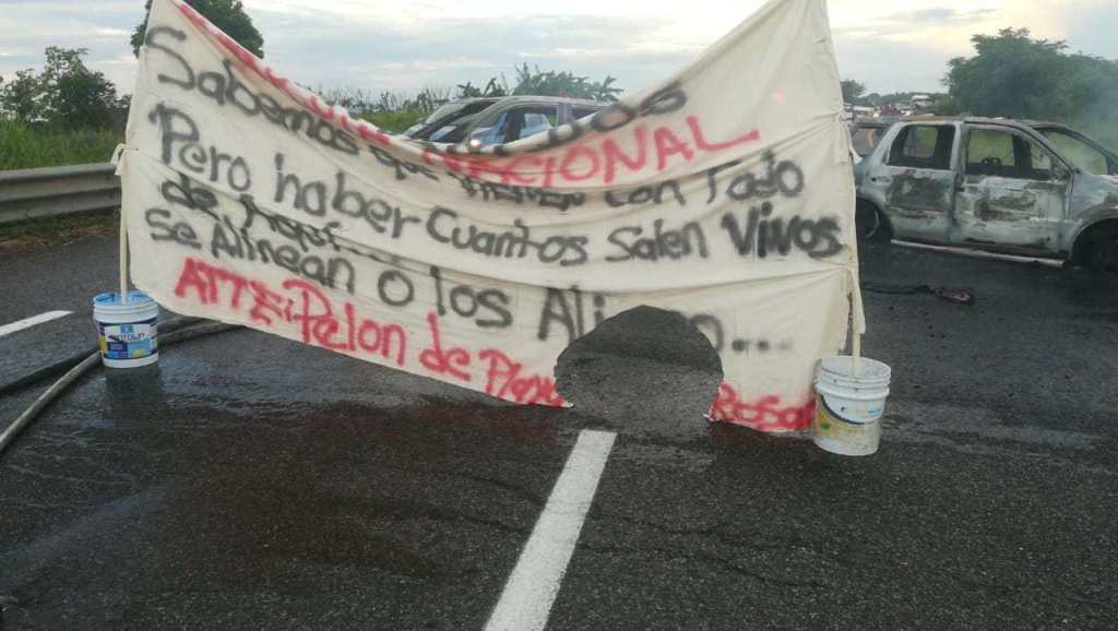 Después del arranque de la operatividad de la Guardia Nacional (GN) y cumplirse este 1 de Julio el Triunfo de la » Victoria de la 4ta Transformación», la mañana de este lunes en la capital tabasqueña, un grupo de criminales armados, incendiaron cuatro vehículos y abandonaron una narcomanta en la carretera Villahermosa-Teapa, cerca de la laguna de la majahua.