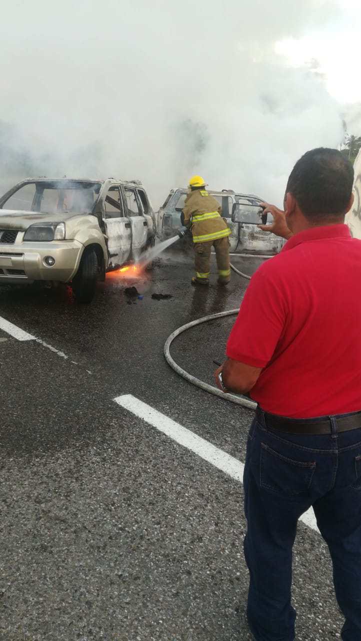 Ante tal situación, los agentes de la policía estatal procedieron acordonar el lugar y pidieron la intervención de los bomberos del Instituto Estatal de Protección Civil los cuales controlaron el incendio y ayudaron a los uniformados a retirar los vehículos incendiados de la carretera. *(Corresponsal ABCnoticias Tabasco Miguel Ángel Mayo)*