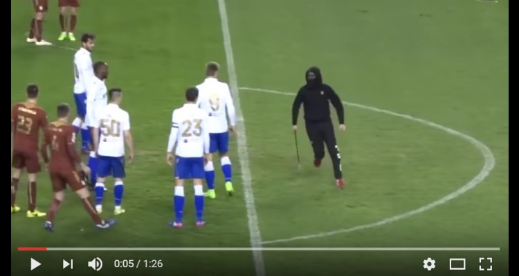 Es la liga de futbol croata y se enfrentan Hajduk Split y Rijeka, en algún momento un seudoaficionado ingresó al campo para intentar agredir al árbitro que apenas lo vio, y patitas pá qué las quiero, salió corriendo.