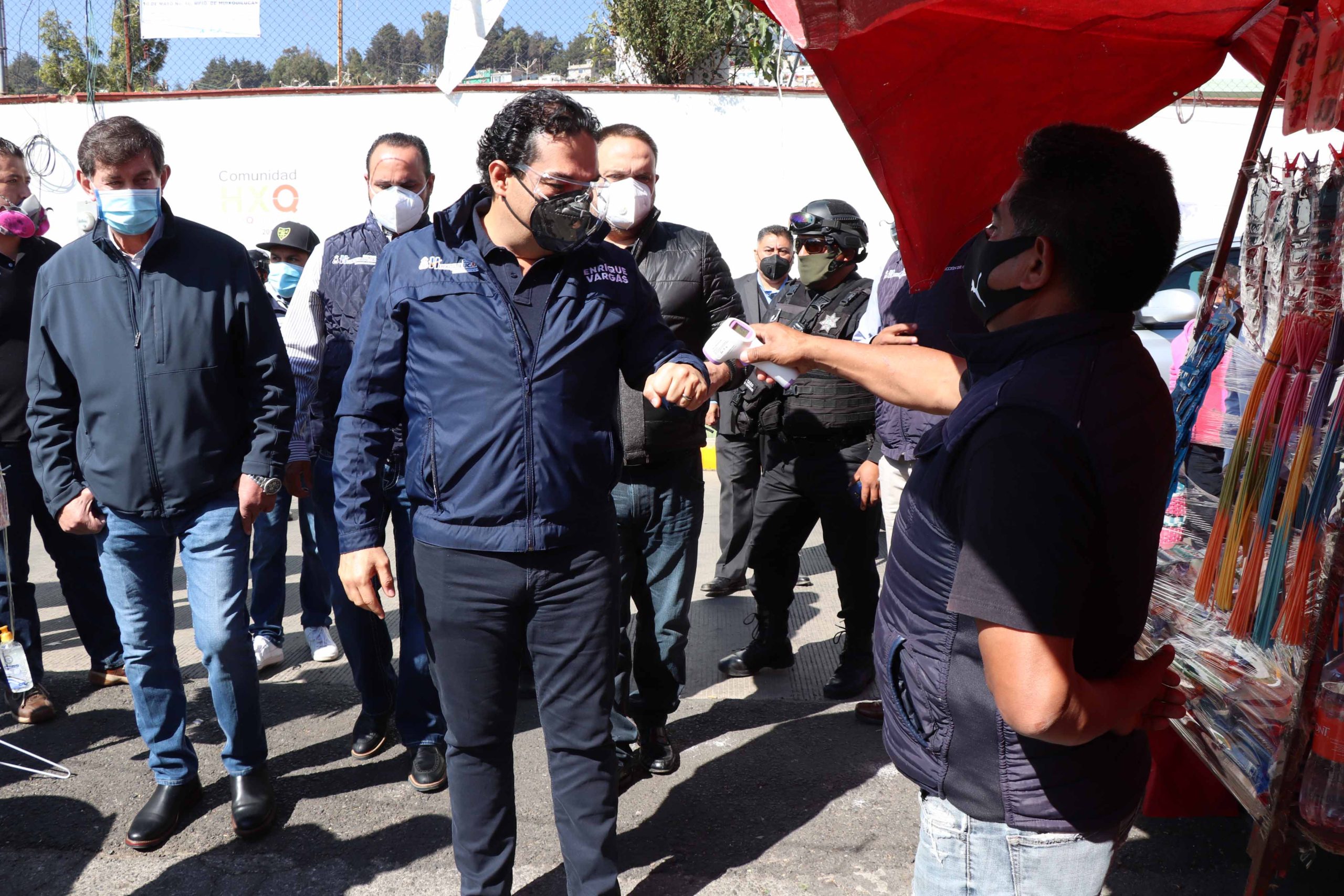 El presidente de Huixquilucan, Enrique Vargas del Villar, recorrió las instalaciones del tianguis de San Martin en la cabecera municipal, donde supervisó se cumplan con las medidas sanitarias, por parte de vendedores y compradores.