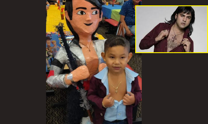 Pero eso no le bastó. También pidió una piñata del personaje interpretado por Ariel Miramontes, y se vistió igual que él, posando para las cámaras de sus orgullosos padres con un pantalón de mezclilla, camisa de vestir azul abierta, un saco color vino, y una cadena de cruz que lució emocionado.