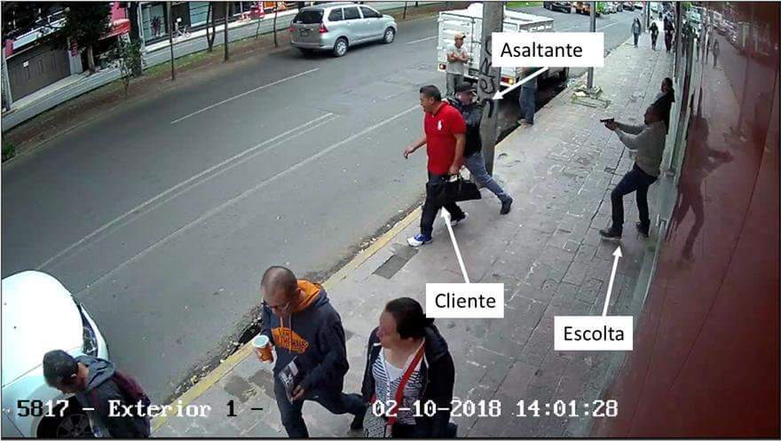 En imágenes difundidas se muestra cuando el criminal corre para interceptar al cuentahabiente que lleva una bolsa con dinero.