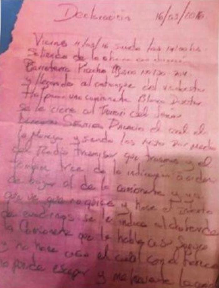 “Siendo las 14:30 por medio del radio transmisor que traemos, da la indicación u orden de bajar al de la camioneta (…) y da la orden de golpearlo y cuando ve que lo graban, me dice que ya lo deje, y el video es la prueba de todo”, refiere en la misiva.