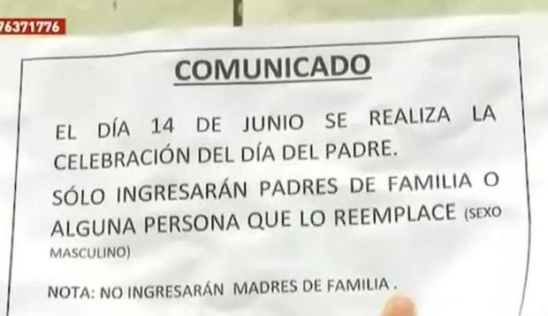 La directora de una escuela en Magdalena, Perú, discriminó e impidió el acceso a las madres solteras que pretendían pasar el Día del Padre con sus hijos, al colocar un cartel a la entrada de la institución, donde prohibía que ingresaran mujeres al festejo.