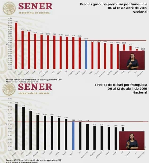 Al respecto, el presidente López Obrador explicó que los costos de los combustibles en las estaciones son precios promedio, ya que éstos varían de acuerdo con la región en la que se encuentra la estación; no obstante, sí establecen una tendencia de que consorcios son los que están ofreciendo el servicio más caro y más barato, para que haya una sana competencia.