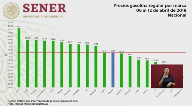 Durante la conferencia matutina de este lunes, la secretaría de Energía, Rocío Nahle, informó que, de las 12 mil 500 estaciones de servicio que existen en el país, distribuidas en ocho regiones, en la semana de 06 al 12 de abril, Shell fue la que ofreció la gasolina regular (magna) a un precio más elevado, al vender el litro a un costo promedio de 20.23 pesos, mientras que PetroSeven fue la que la ofertó a un precio más económico de 18.74 pesos por litro.