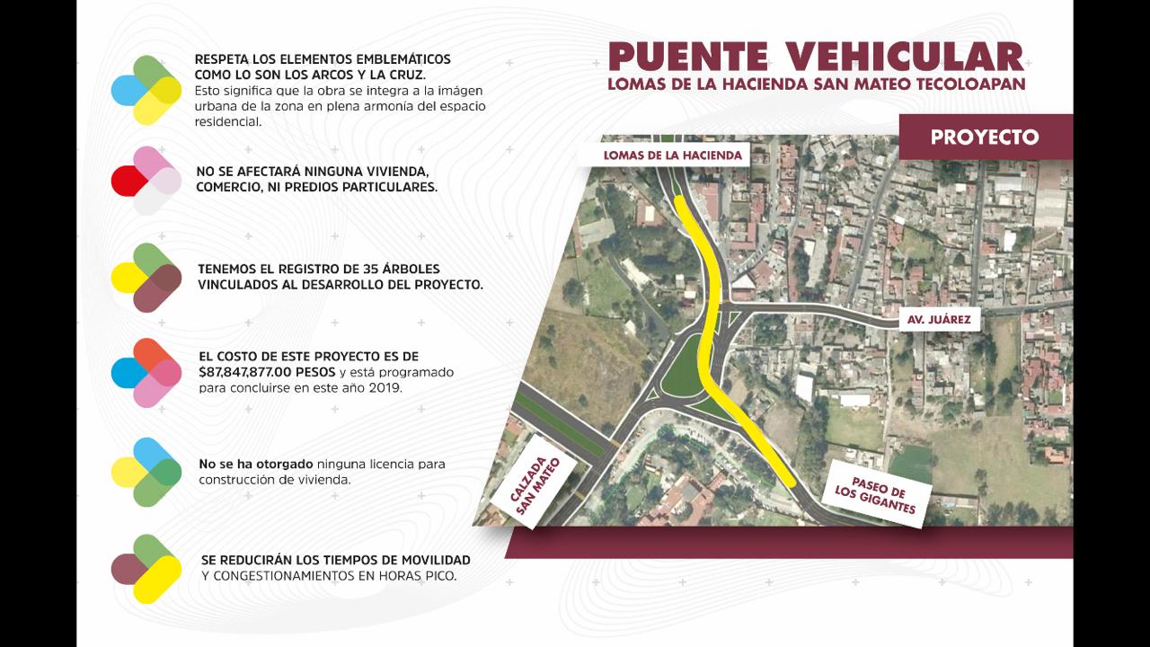 El gobierno municipal de Atizapán de Zaragoza presentó el proyecto integral para la construcción del puente vehicular Lomas de la Hacienda-San Mateo Tecoloapan para resolver el tráfico que se presenta en la intersección de las vialidades Avenida Juárez, Paseo de los Gigantes, Calzada San Mateo y Lomas de la Hacienda.