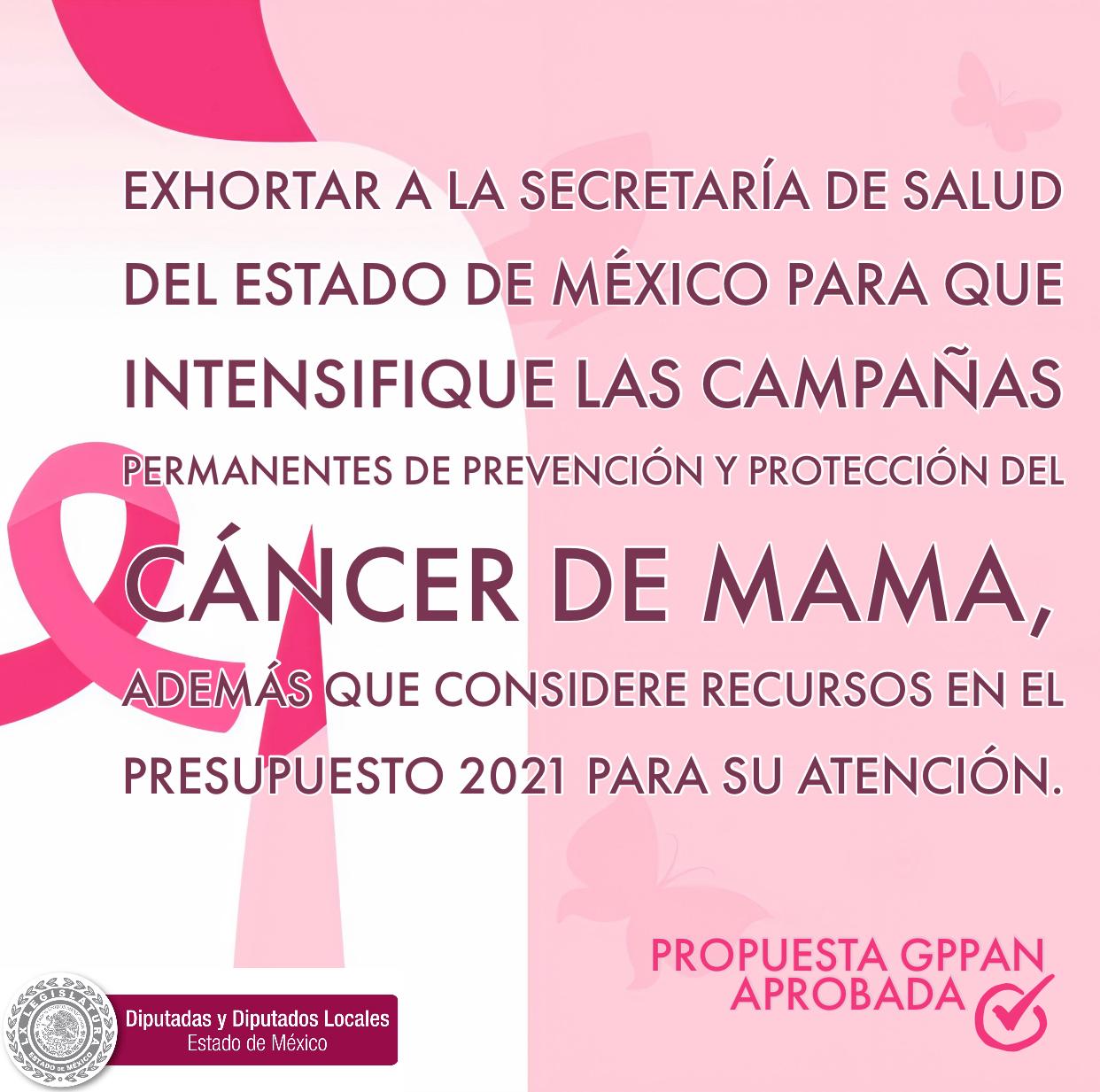 La legisladora panista reveló que el número de consultas en la entidad, ha incrementado un 15% en los últimos 4 años, cifra por la que la Secretaría de Salud debe intensificar las campañas permanentes de prevención y protección del cáncer de mama para que acerque caravanas de salud en las localidades de menor acceso, refuerce las campañas de difusión y brinde una atención integral a las mexiquenses que sufren este padecimiento. El punto de acuerdo fue aprobado por el Pleno de la LX Legislatura del Estado de México.