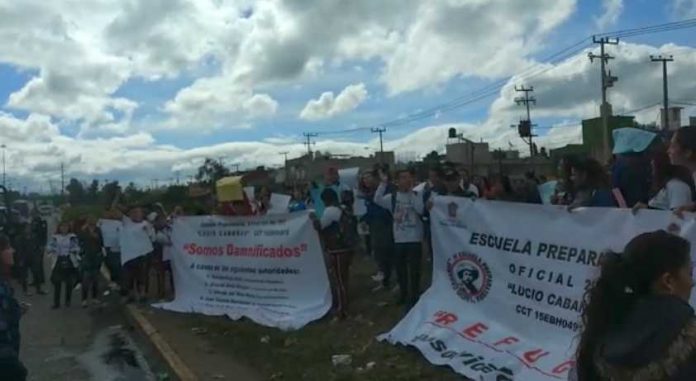 El grupo de estudiantes se apostó sobre el periférico y avenida Central, para exigir a las autoridades la rehabilitación total del plantel educativo, ubicado en la calle Tlacomecatl en Plazas de Argón.