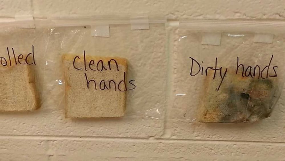 El ‘experimento limpio’, como la misma profesora lo ha bautizado, consiste, simplemente, en colocar rebanadas de pan en bolsas de plástico transparentes para ver cómo actúan los gérmenes en los alimentos.