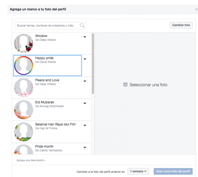 Por ejemplo, los usuarios de Facebook pueden agregar la insignia multicolor a su foto de perfil; solamente tienen que hacer clic en la imagen y esto le mostrará la opción para agregar un marco o filtro de arco iris con el tema del Orgullo.