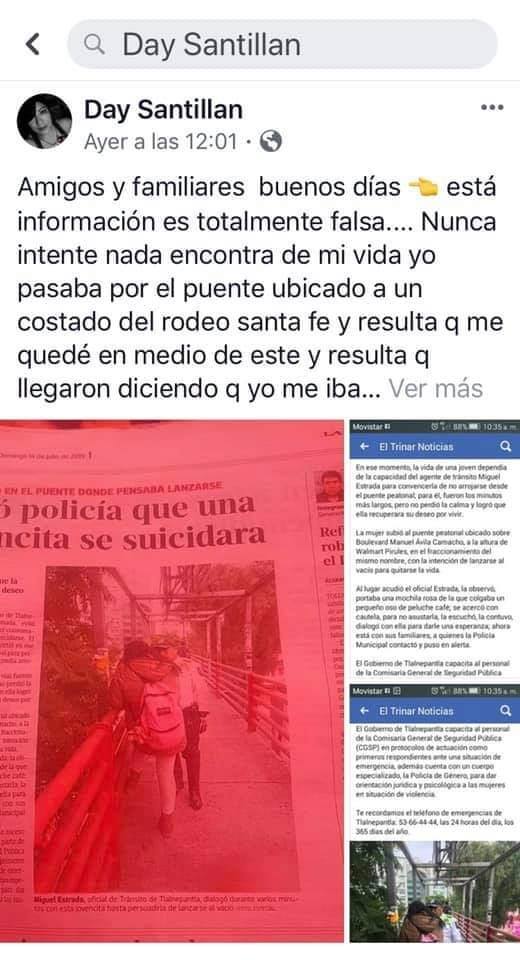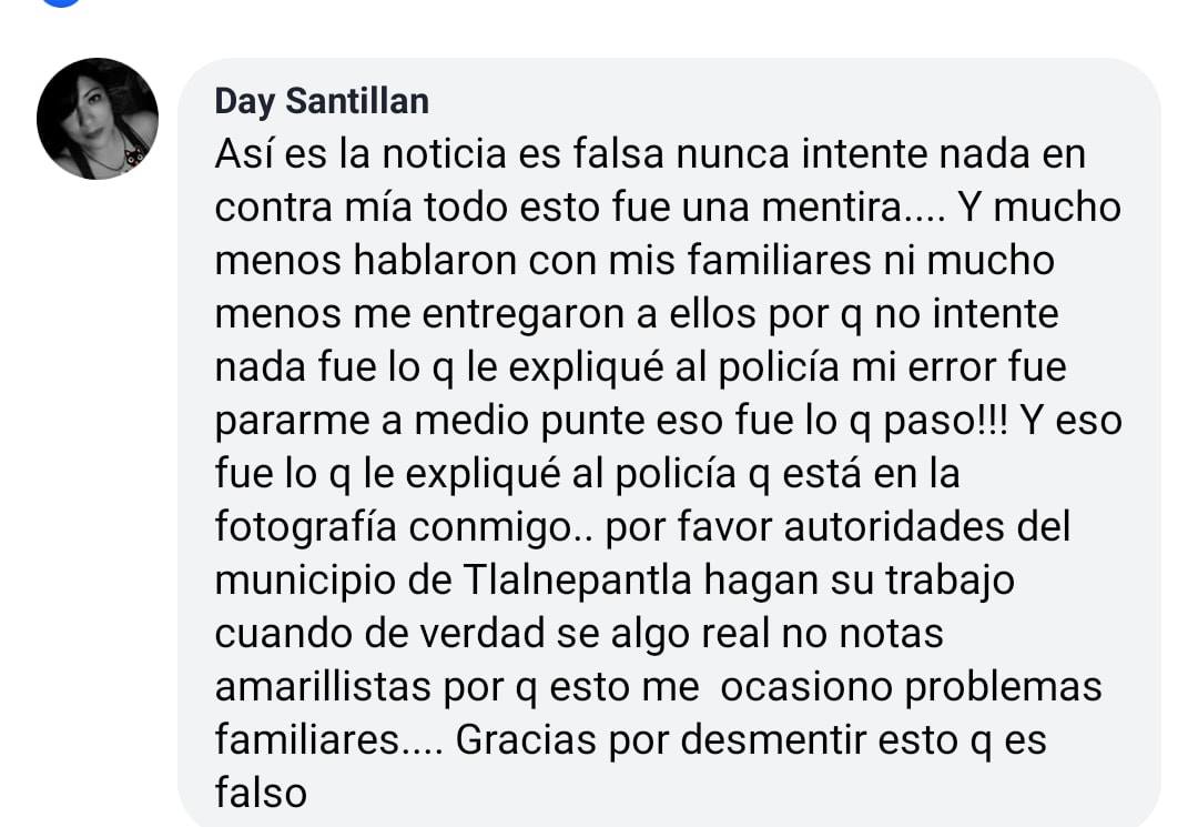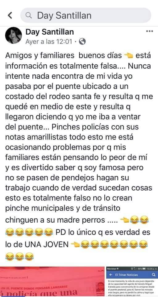 “Amigos y familiares buenos días ? está información es totalmente falsa…. Nunca intente nada encontra de mi vida yo pasaba por el puente ubicado a un costado del rodeo santa fe y resulta q me quedé en medio de este y resulta q llegaron diciendo q yo me iba a ventar del puente… Pinches policías con sus notas amarillistas todo esto me está ocasionando problemas por q mis familiares están pensando lo peor de mí y es divertido saber q soy famosa pero no se pasen de pendejos hagan su trabajo cuando de verdad sucedan cosas esto es totalmente falso no lo crean…”, señala el post en facebookear la joven.