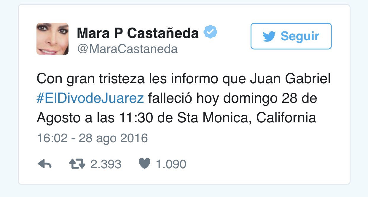 “Con gran tristeza informo que Juan Gabriel, el divo de Juárez, falleció hoy domingo 28 de Agosto a las 11:30 de Snta Monica, California”, publicó la comunicadora.