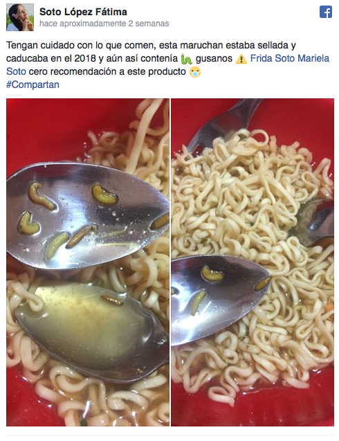 Cuando destapó y preparó una de estas sopas instantáneas, el pasado 31 de julio, la usuaria de Facebook Fátima Soto, residente de Zacatecas, no esperó encontrar un “ingrediente extra” muy poco apetecible.