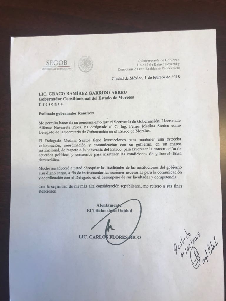 El ex alcalde de Chalco, Felipe Medina Santos, fue nombrado delegado de la Secretaria de Gobernación en el estado de Morelos donde gobierna el perredista Graco Ramírez Abreu.