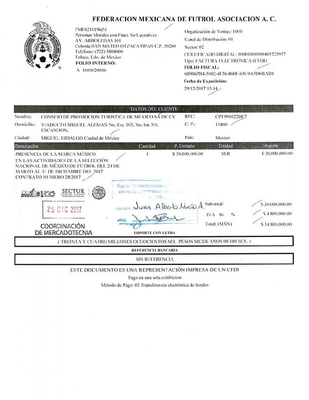 El 29 de diciembre de 2017, la Femexfut emitió la factura A 1610020036 por 34 millones 800 mil pesos, la cual fue recibida ese mismo día por el CPTM.